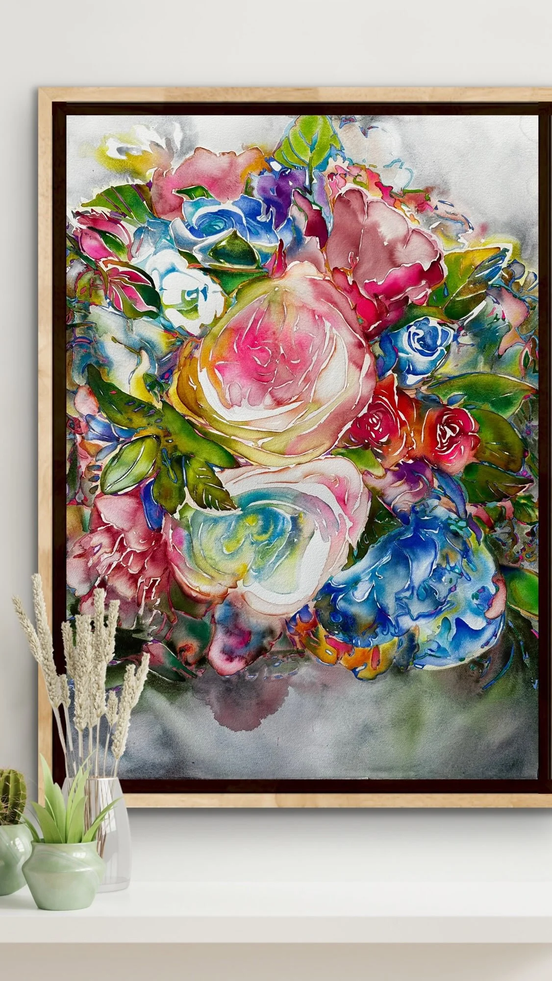 Abstract watercolor painting of green cactus plant with a small person figure in the bottom left corner.